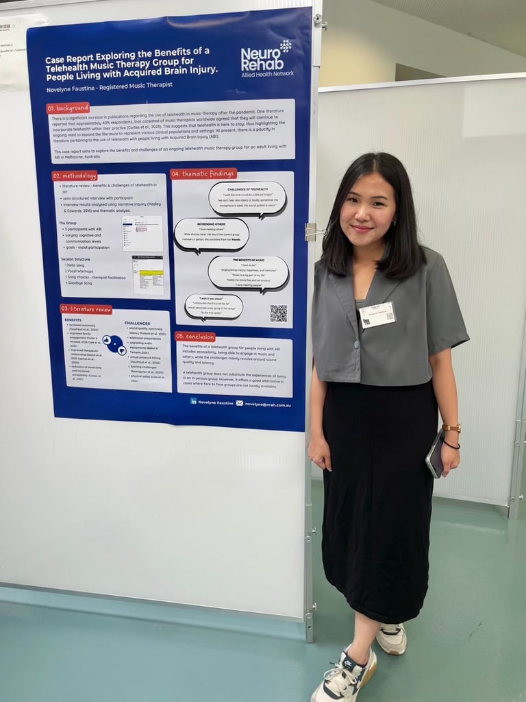 Novelyne is registered with the Australian Music Therapy Association (AMTA) and has also undertaken additional training as a Neurologic Music Therapy® Music Therapist (NMT™), demonstrating specialised expertise in neurologically-informed approaches to therapeutic music-making